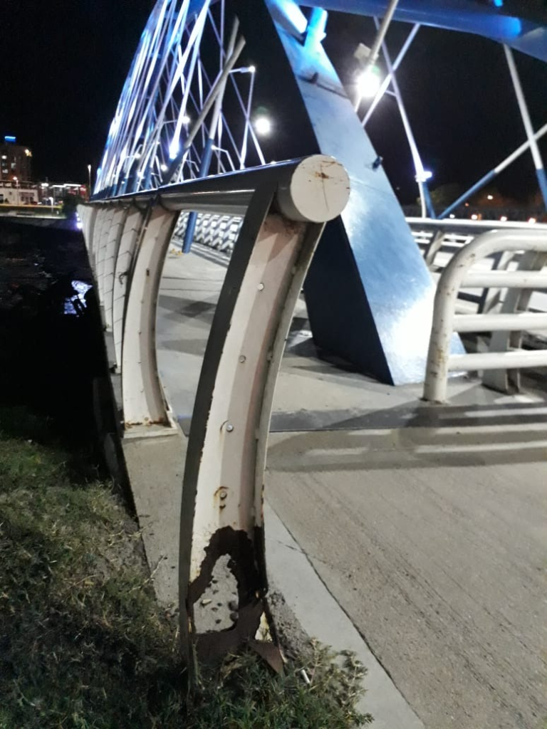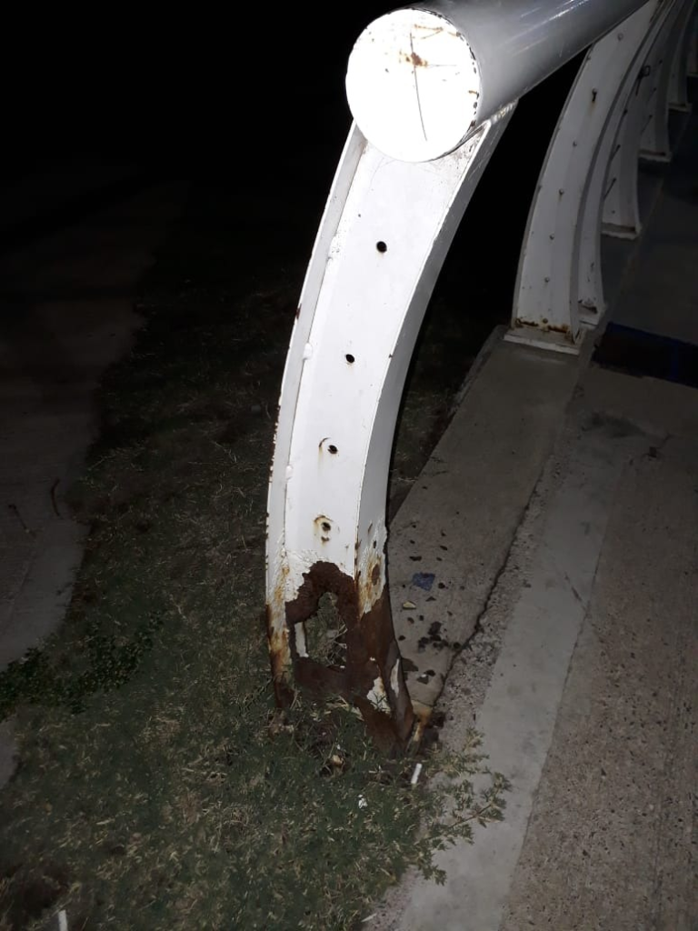 Lo cierto es que parece que la dirigencia política de ambos municipios, ha lanzado al olvido a la formidable plataforma. Solo bastará recorrer el J.D. Perón para observar la desidia con la que se tratado a tan elemental obra. Todo parece indicar que siete años después desdeñaron algo tan elemental como es el mantenimiento del mismo. Solo es necesario recorrerlo de a píe para observar que, en lugares específicos, como son las cabeceras, la herrumbre y el óxido ha comido chapas, (de dos o tres milímetros), algunas de ellas con agujeros que la traspasa de lado a lado.