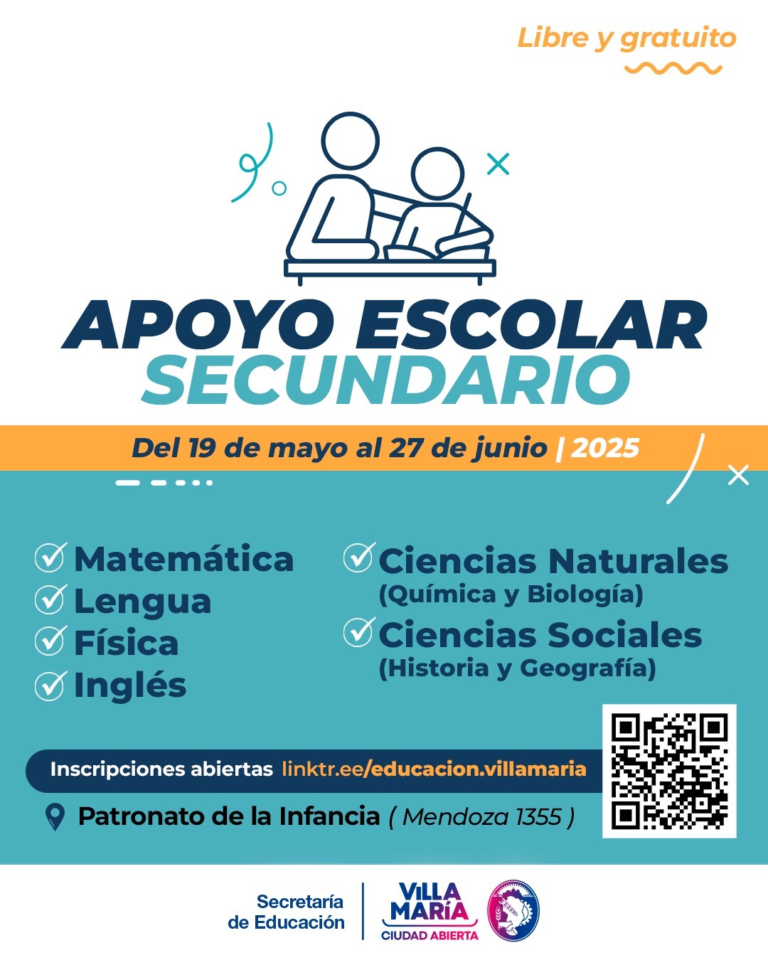 La Municipalidad de Villa María informa que se encuentran abiertas las inscripciones para la segunda etapa del programa de Apoyo Escolar Secundario.