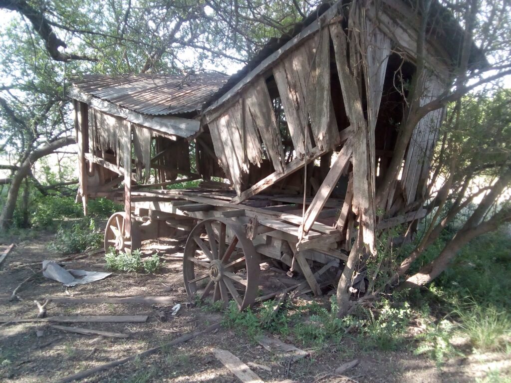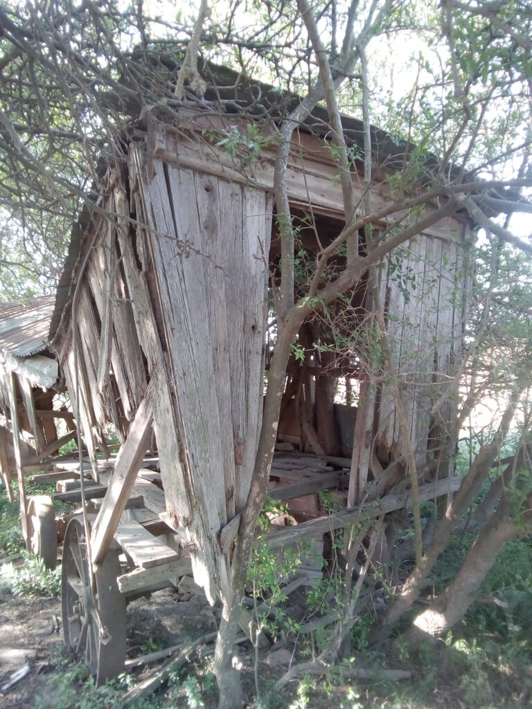 Descansando el sueño final, bajo un añoso algarrobo y un tala, con algunos árboles jóvenes entrometidos que empujan su estructura, con la complicidad de duraznillos en la isletilla de monte, la que fue una casilla tirada por caballos, hace patente el feroz paso de los años. Pero con hidalguía hace presente los recuerdos que atesoran sus ruedas de hierro, el maderamen vencido y un chasis que porfiadamente continúa sosteniendo la estructura.